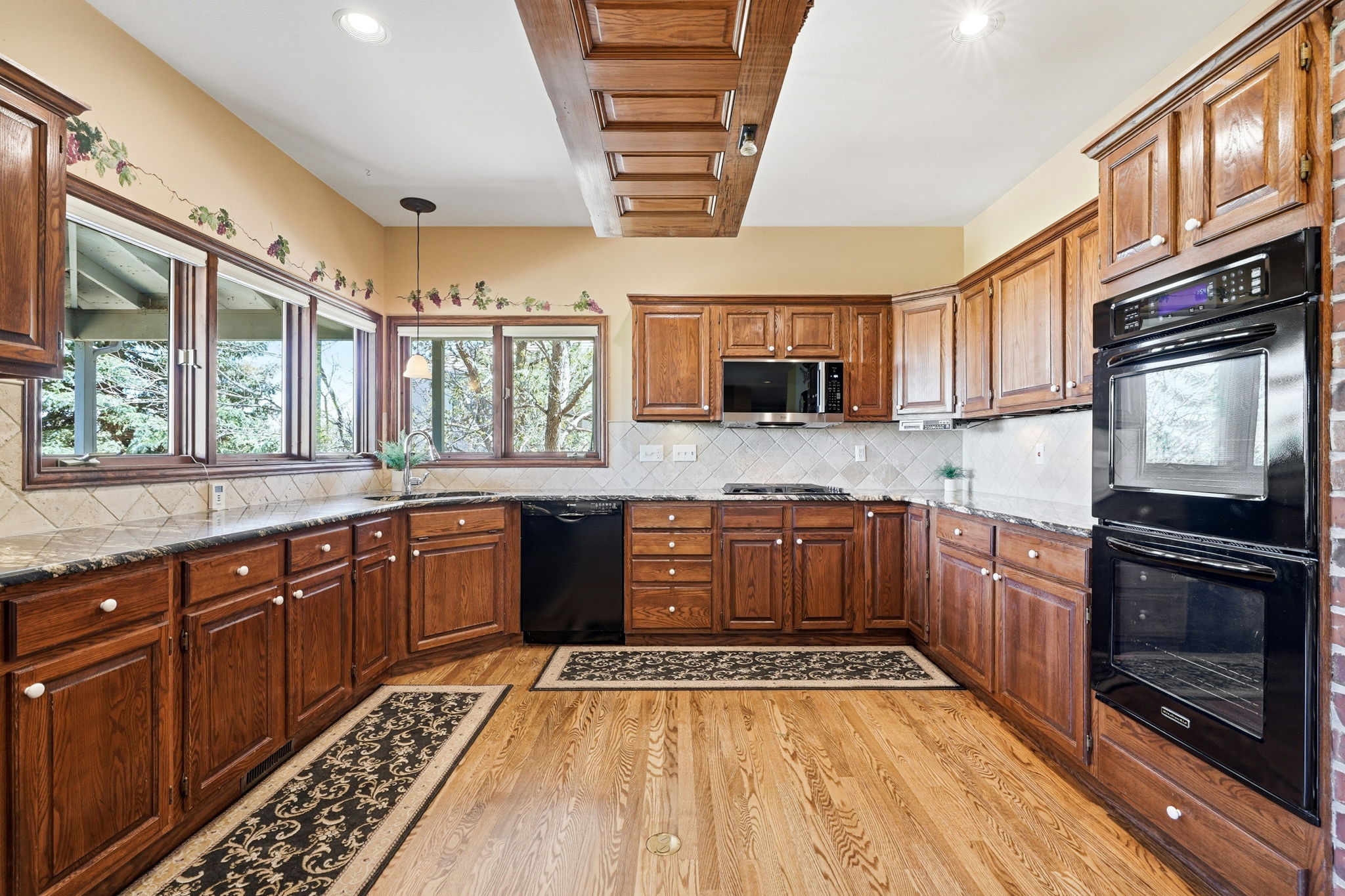 The kitchen features granite countertops, double ovens, new cooktop and microwave, a generous pantry, and seamless flow into the dining area and out to an expansive wraparound deck—perfect for entertaining or taking in the remarkable setting. The adjacent family room offers French doors, a fireplace, and direct deck access, while the formal dining room with built-ins and a bay window connects through a butler’s pantry.